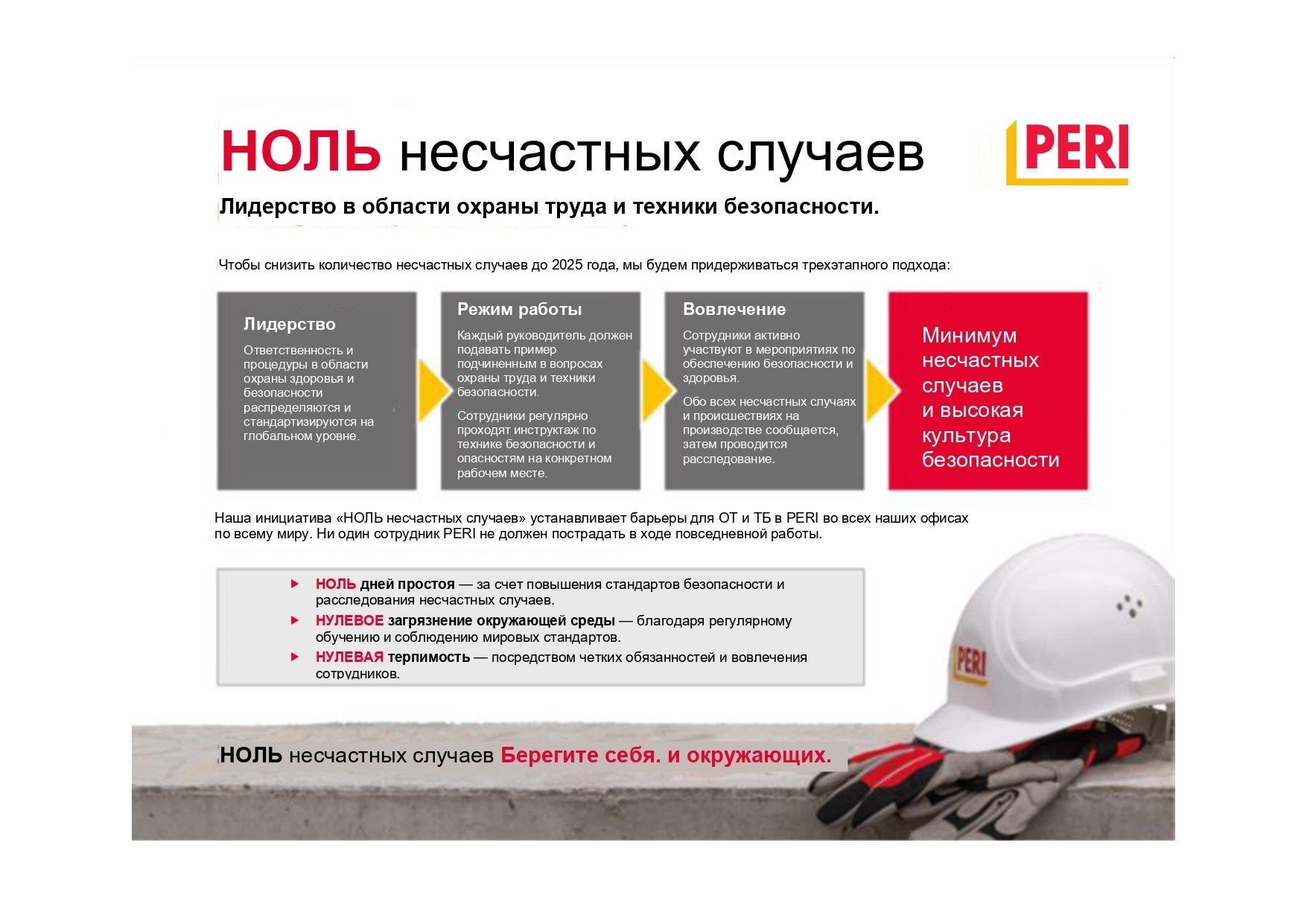 Наши ценности и факторы успеха— вот основные принципы нашей деятельности. Девиз нашей компании звучит так: «Мы делаем строительство более эффективным, быстрым и безопасным». Поэтому безопасность и охрана труда являются наивысшим приоритетом для PERI.